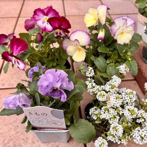おはようございます♪ 昨日postしようと思って忘れてました💧 近所の園芸店で可愛いパンジーがあったのでお迎えしました🌼 アリッサムも☺️ 『きもの』はフリフリ系のパンジー あとの2つは札がないから名前は忘れた😅 綺麗な色に惹かれました✨✨
