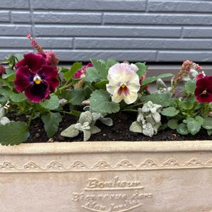 ゚.*ꕤ パンジー(きもの) ꕤ*. ゚ 寄せ植え風の鉢植え🪴のアスターがまったく咲かない… お花屋さんに聞いてみたら 日照不足かもよ🌥️と。 たしかに半日しか陽が当たらないかも…🤔 なのでアスターさんは 陽当たりのよい場所に地植えしてあげて 入れ替えをしました♻️ ふりふりでニュアンスカラーが素敵〜💜 と、お迎えしたパンジーのきものさん。 数日したらなんだか色が濃くなった☺️? ❸寄せ植え風の🪴 気がついたら葉っぱしかなくてびっくり(*ꆤ.̫ꆤ*)笑 パンジーさんをお迎えして 華やかさんになりました( *´艸`)💜