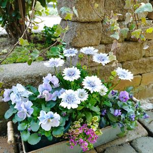 おはようございます〜💠🌼 朝晩の寒さがこたえます〜🤍🩵 が、そろそろ今季最大寒波も終わりそうですね😉 でも、まだ2月ですからね〜🤍🩵🩵 ①マーガレット バブルガムブラスト💠🩷 ②パンジーきもの🤍💜 ③パンジーパピージョルジュグランデ🤍🩷 ④ネモフィラ🤍🩵 ⑤ラックス ヘラのキメラの蕾🤍🩷 1月に迎えたマーガレットバブルガムブラスト、花数が増えてかわいい〜🤍🩷🩷 パンジー着物もジョルジュグランデも綺麗に花数を増やしています~😍💠 この着物のパフォーマンスには驚きです〜🤍💜 今秋も出会いたいですね〜😍🤭🎉 現在ネモフィラの種類って多いのですね〜🩵💙 この色のネモフィラ初めて発見〜🤣🎉 ポピュラーな色のネモフィラを2株手持ちに有るので、この色は1株購入したのですが、春が楽しみです〜〜😉🤭🎉 ラックスヘラのキメラの蕾ですが、ピンボケでごめんなさい(_ _;) 確実にキメラです〜🤍🩷🎉 購入時キメラ1輪、その後普通の開花でしたので、もうキメラは出ないのかな〜と思っていましたので、とても嬉しいです〜~🤭🎉🎉 そろそろ店頭に、pwやサントリーフラワーズさんの春夏のお花が出回りますね〜🤭🎉 〈💠春近し〜〜💠🩷🩷〉