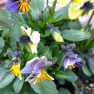 少しずつお花が増えてきた我が家のパンビオたち ①色変わりビオラ天使の誘惑 ②ビオラブルーラビット ③ビオラなごみももかトントン ④名無しのビオラ ⑤パンジーきもの