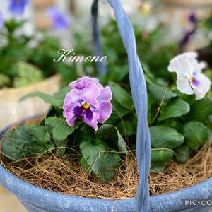 おはようございます^ ^ パンジーきもの*の寄せ植え🤍💜 籠型の青いプラ鉢に寄せました♡ リーフを入れたりしてみましたが、これはシンプルに2つだけが1番素敵💕 モリモリになったら可愛いだろうなぁ♡^ ^♡