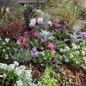 冬花壇へ この花壇のパンジーは 全て『きもの』という名前がつけられているとか👘 色味の異なる紫系の緩やかなフリルたち🤍 他… ヘリクリサム2種 コプロスマ 銅葉金魚草 アリッサム オダマキ サントリナ リナリアなど