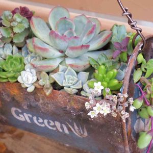 ぶら下がりバスロマン缶💕 入浴剤の出る穴をふさごうと思ったけど、そのまま活用😊 ルビネとツルマンネングサをダラ〜りさせました😁