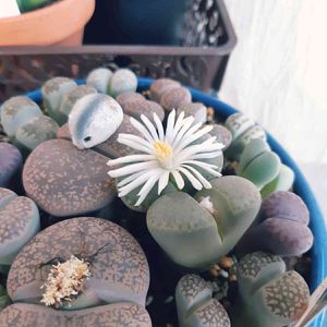 リトープスがまた咲いたよ🎵 前回は手前の子が黄色い花を咲かせたけど 今回は白い花🌼 お隣さんも頭出てる✨ 昼間に見たときは👅が出てる状態だったのに咲き始めてるみたい❗ 2つ並んで咲いてくれるかな?