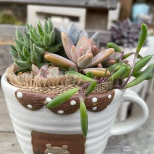 わーい❀.(*´▽`*)❀. 仕事帰りに、笠間焼マルシェで多肉入り可愛い〜植木鉢お迎えしちゃった🪴 暗くなる前に急いで記念📸