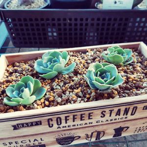七福神のベビちゃんが大きくなってきたからカットして植えてみた😃 可愛い100均のBOXに植えてみたけど、 コーティングなしでどのくらい持つかな?