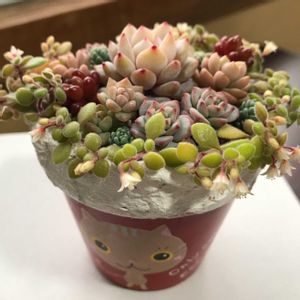 昨年の3月に可愛いリメ鉢を買って、やっと…やっと!多肉さんを寄せ植えしてみました(*´艸`) つくづくセンスないけど可愛い鉢がフォローしてくれてます♡