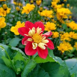 ❀*. 雲のすき間からの日光浴 ダリア ハーレ〜クイーン❤️💛 迎えてからもう2週間〜 迎えた時に一輪咲いていたけれど✂️ 咲いてきた二番花です⸜(*˙꒳˙*)⸝ 奥のピンクは名無しさん コラレット咲きは可愛いです💕💕