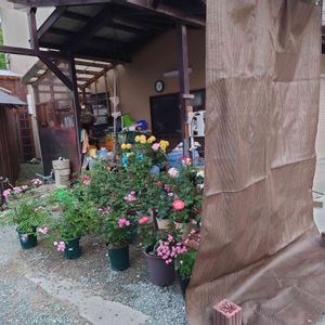 梅雨なので 軒下に薔薇たちを避難させてますが、今日みたいに晴れるとすんごい西日😰 移動面倒なので、日除けしました〜!!! 2番花がぼちぼち咲き出しました!!