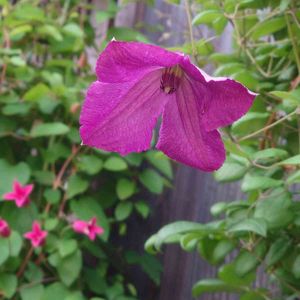 クレマチスちっちゃい花シリーズ、第4弾!!! と言っても、大きさは中輪かなー?こちらも咲いてきました。 雨が降りそうで、軒下移動したら、いい天気にー😅