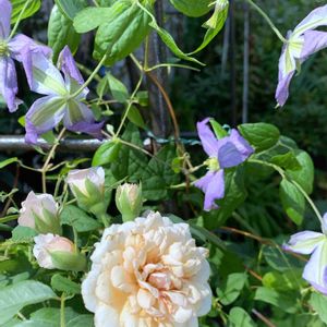 クレマチスの蔓がバラの茎をガッチリホールドしています。 一緒に咲くと良いね☺️