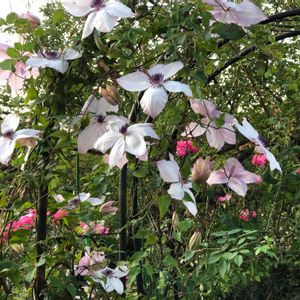 ギリギリコラボのピエールさんとエレガさん。 咲くと重くて下向いちゃうので後ろ側に向かって咲いてるいくつかの花は折れてしまって切りました。 来年は後ろ側に行かないように仕立てなくては…日々勉強ですね。