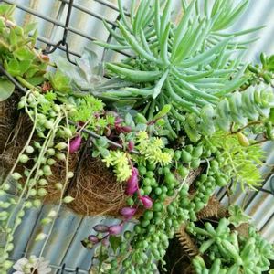 こんばんは😊また寄せ植えの紹介です🎶 上はサビサビの網を曲げて植えたものです😁引っ掛けタイプ✨ 下はハオルチアやユーフォルビアの寄せ植えです(^^)