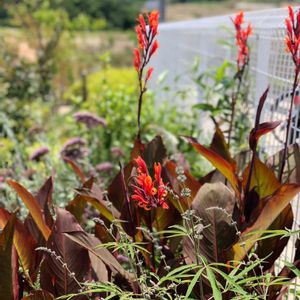 お山の上の工場前の花壇より 銅葉のカンナが 今年は去年よりさらに大きな株になって 元気に咲き始めました