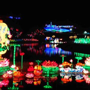チャイナランタン 池に浮かぶ蓮の花 中央奥の遠く小さく見えるのがイルミネーション会場です。 いいね、コメント頂いている皆さんお返事が出来なくてごめんなさい😅