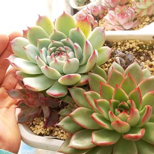 エケベリア イブと水蜜桃 なおきんに貰った3cmの子達が ハウス雨漏りの影響で巨大化したよ😅 エアマジックがつぶされw ラウイ1個とピンクザラコーサは お腐れてしまいましたけどもw たった1年でここまで成長出来るのね🤔 水の加減でグラプト並に成長って かなりのもんよ🤣 形はともあれ生産するには ハウスの回転は早い方が良いよね🤔 良い参考になったわ🤣