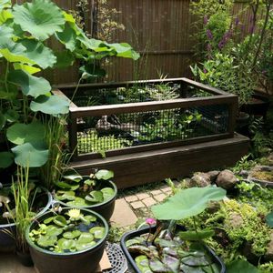⚠️亀ちゃんいます ここはプラ舟ビオトープとうたいつつ実は亀ちゃんのお家なんですが、陸で食事をする事が多い日本石亀ちゃんの為に屋根付きの食堂を設置! これで朝あげた食事が雨で濡れる事がなくなりました♪ しかしこのままだとスタイリッシュ過ぎるので剪定した枝とかでカスタマイズして、もう少し隠れ家的な感じにしようかと思います!ちなみに初代亀ちゃんが逃走してしまった反省を生かし、ネット最上部は巾10cmの返し板が設置してあります!サスケ級の亀でも絶対クリア出来ません(笑) GSに関係ない投稿(笑) (; ・`ω・´)