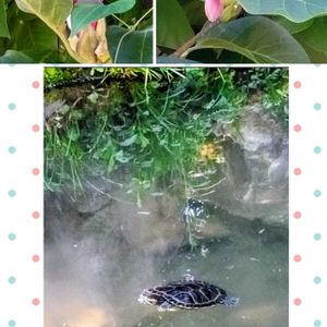 こんにちわ👋😀☀️ 8月最後の日曜日、今日も35゚Cの残暑🥵 が続いています💦 ①↖️↗️青々とした紫木蓮の葉🌿の中に 綺麗なピンク色💞良く見👀ると蕾が 出来ていました🤩毎年春に咲く紫木蓮✨ あまりの暑さに狂い咲きでしょうか⁉️ ⬇️近くの公園の池に可愛い小亀🐢さんが 泳いでいました♡メダカも一緒に~♪◡̈* 水面に写る草花が涼しげです🎵 ②同じ池で親亀🐢でしょうか近付いて来 て水の中から顔だけチョコンと出して ご挨拶してくれました😂💦 ③街路樹のサルスベリ🌸まだ綺麗に咲い ています~🥰 ④今、室内で咲いている唯一のお花♬*゚ アンスリウム❤️繰り返し一年中 咲いてくれています😊ෆ̈。 9月もどうぞ宜しくお願いいたします💕 🍀🤗🎶✨