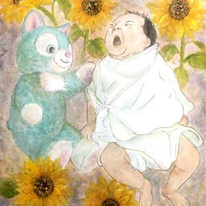 ちょうど今描いてた ひまわりと赤ちゃん「泣く子は育つ夏」 GSなのに、こんなのアップして良いかなぁ😅 4つ下のpicのひまわりをスケッチして、 描いた日本画です🌼