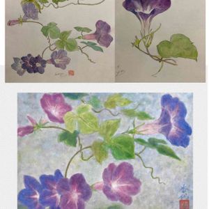 母が育てた朝顔 今日のお花🌸ではなく、随分前に咲いたものですが(๑́•∀︎•๑̀) 本画に仕上げるまでに何日もかかってしまうので、 スケッチと一緒にかならず写真を撮るのですが… これは何年も経つので、写真がどーしても見つかりません。。 上2枚はスケッチです。 構図はスケッチの方が伸び伸びしてますねฅ(º ロ º ฅ)ハッ 下の本画にする時に、なぜ窮屈になったかと云うと… あれですね、パネルや額がFサイズだから💦 そこへ合わせると、伸び伸びした蔓がカットされちゃったんですね😣💦イヤハヤ…