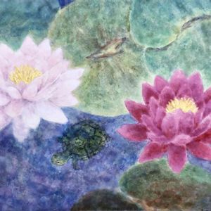 11月6日のお花 なぜこの季節にスイレン?と思いつつ… もう20年も前に、我が家に来た赤ちゃんの頃の亀🐢と、睡蓮を描きました