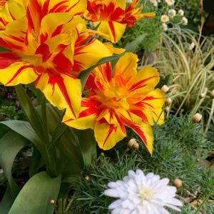 賑やかなチューリップの隣では 越冬したマーガレット♡モリンバがやっと咲き始めました✼˚•༚ʚෆ⃛ɞ༚•˚✼ 蕾もたくさん出てきたぞ〜✩⋆*॰¨̮⋆。˚