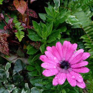 9/18にヒポエステスの ピンク系に合わせた 寄せ植えを、そろそろ 解体してと思っている ところ…… 雨がやんで見ると ピンクのオステオスペルマムが咲いててびっくりです。 大事にして冬越しをさせたいです。