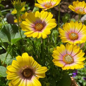 おはようございます🤗 今日の私のお花はオステオスペルマム:ヴィエントラベンダーです🥰👍 ◎ オステオスペルマム:ヴィエントラベンダー までにない新鮮なカラーで強健なオステオスペルマム。シンフォニーシリーズは極早生で四季咲き性の強い品種です。オステの強さとディモルフォセカの連続開花性を兼ね備えた品種です。従来品種より暑さに強く、夏場でも風通しの良い所であれば休まず咲きつづけますので、長い間楽しむことができます。つややかな花弁を持ち、コンパクトで多花性で、花壇、コンテナ、ハンギングにも向いています 栽培方法: 日当たりと水はけのよいところを好みます。酸性土にやや弱いので、苦土石灰をすこしまいてから植えつけます。寒さには比較的強いのですが、霜や寒風からは敷き藁やフレームで保護するようにします。寒い地域では3月頃までは日当たりを好むので冬は明るい室内で管理します。夏は直射日光が当たらない場所にします。乾燥に強いので、水は乾いたらたっぷり与えるようにします。春から秋は緩効性肥料を1ヶ月に1回程度根元にまくか、あるいは薄めた液肥を週に1回程度与えてください。咲き終わった花は枝分かれした上のところで摘み取ると長く楽しめます。全ての花が終わったら3分の1程度の高さに刈り込み新しい芽をださせると秋にもう一度開花します。開花後または秋に出る芽を挿し芽するとよくつきます。 花壇の中で綺麗に咲いていました😃💜💜🍀💜💜 今日も健やかにお過ごしください(o^^o) 💜🍀💗🍀💗🍀💜🍀