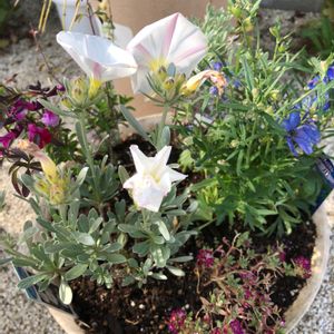 冬に作った寄せ植。 忘れ去られたシルバーリーフ🍃の花が咲きました😃