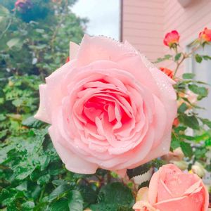 雨の中のアフロディーテ。 ザ・お姫さまピンク!の大輪バラです😊 去年新苗500円だったのでつい買ったバラですが、うちのバラたちの中では一番病気に強く、暑さ・寒さにも肥料過多にも動じない強健さん。