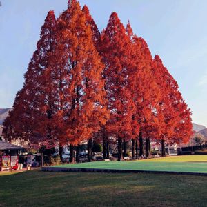 朝日を浴びるメタセコイヤ…昨朝 インフルで1週間出遅れたけど… まだまだ落葉手前でよかった🤗 日の出と共に煉瓦色に染まり始めてました 帰り際近寄ったら…雄花序も見れました✨