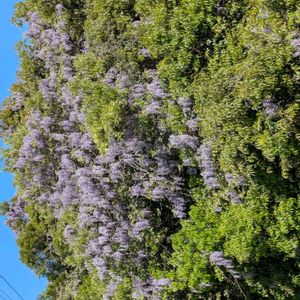 山道のフジが咲き誇っています ⑤植林のヒノキの先端までフジが登りました