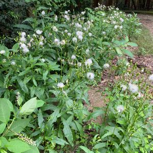 ハイキングコース。杉の木立の間から向こう側の集落(街かな)が見えました。気になる🌟 右の紫の花なんでしょうか?シソ科? 左下はなんでしょう?マメ科?林道脇によく見ます。 右下はガンクビソウと教えていただきました。インパクトあるお名前。タネも面白いようです。 2019.8.25 あきる野市 横沢入