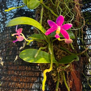 今日のお花はコチョウランなので、もう一つ投稿します 原種です Phal.pulchra ‘Oscar’ ファレノプシス プルクラ ‘オスカー’ 高芽の高芽を板付けしたものだそうで、 一年前、蘭屋さんの温室で一目惚れして即決❣️連れて帰りました その時はお花が無かったんですが、この夏3つ咲いてくれました♪ 一期一会、蘭屋さんの温室大好きです😘