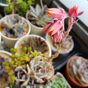 【多肉植物✴︎寄せ植え】 週末タイム失礼します 前に寄せ植えを作っていた器の多肉植物を整えて新しく作りました。その後、花が咲くまで待って❇︎❇︎❇︎本日開花のpic☆🌈🐈⬛久々の太陽光がさしすぎて虹の光入り💕