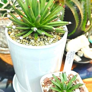 とっても変わってる先っぽに綿毛が生えるアガベちゃん✨ オカン邸の子(大)の植え替えついでに僕の子(小)と記念撮影🎶 綿毛が白銀で可愛すぎ②だし、開かんでも何だか可愛い集合体③🤭 でも、先の刺はしっかり硬くて痛い😂 すっごくす〜っごくのんびり屋さんだけど、子株も出てきてるし、綿毛全開になるのが楽しみだぁ〜✨✨