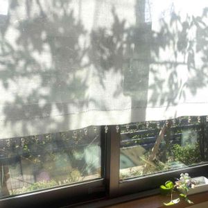 テイカカズラが朝日を受けて、リネンのカーテンに映るのを楽しんでます