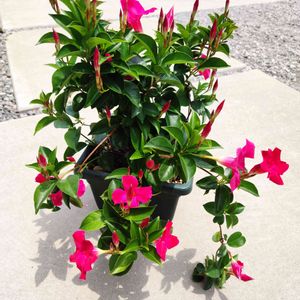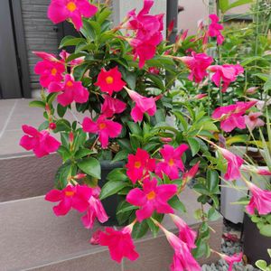 屋外で冬越したマンデビラ🏵 元気ありすぎて大量に花咲くので 毎日玄関前を賑やかに してくれます(^o^) しかも長いこと咲くので それがまたいいですね♫♫