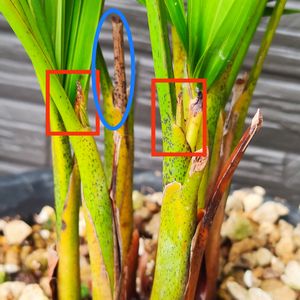 ベランダ越冬のアレカヤシにプラスな変化あり🌴 冬の間に外に出したままなので芯が2、3本抜けたが、根元が元気そうだったので生きてるのかなと放置してた所🌴 🔴赤枠の箇所が新芽が伸びてる。 🔷青枠もいずれ出てくるかな🌴
