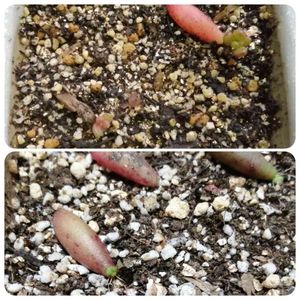 虹の玉の生長 4つの葉っぱを置いてたけど1つはすぐに消えてしまい、前回撮った時には3つの葉っぱの2つから芽が出ていた👀 その後葉っぱが出てない1つも消えてしまい😥 1つは親葉が消えそうですが ゆっくりだけど生長してます😊