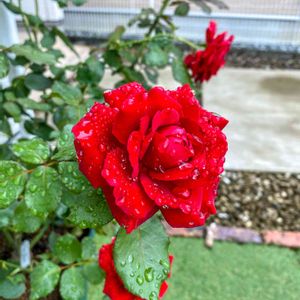 R5年5月26日(金) おはようございます💕😁💕🌱🌼 わが家の薔薇🌹 No.10 スウィートキング🌹 玄関口のインターフォン真下にお住まいの鉢で楽しめるガーデンローズの真っ赤な薔薇(///∇///)👏🌹 やっと開花してきました🎵 すぐ真上にははまっているコウモリランちゃん😁💕 玄関口が華やか~ヽ(´▽`)/🎶✨✨ 今日は、バスルームを模様替えして~徹底的に磨きます🛀💪✨ 皆様、良い1日を🌱