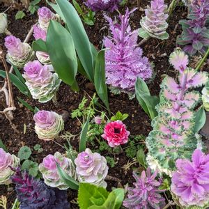 紫系の寄植え🔮💜🫐 昼間の気温が高いので葉牡丹がどんどん徒長して暴れてます🐿️🌿