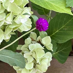 なんだか勿体なくて、 エアプランツ引っかける針金に差し込んでみました。 最後までアジサイはかわいいな🍀💕