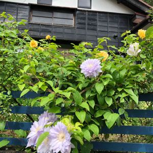 薔薇とクレマチス 薔薇のティージングジョージアとクレマチスのベルオブウォーキング ベルオブウォーキングのお花は大き過ぎます😅