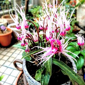 孔雀の羽のような尖った花びらと細い葉が特徴の変わり咲きシクラメン🩷❤️🤍 細い花びらがユニーク素敵💓