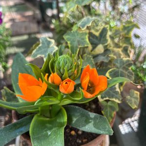 このオレンジ色の花はオーニソガラムです。 私の知っているオーニソガラムは白い繊細な花なんですが、これもオーニソガラム。球根植物だそうです。 乾燥気味に育てることとお店のフリップに書いてあったので、枯れたマリーゴールドとメンバーチェンジしてアイビーと寄植えにしました❣️ 忘備録として6月から9月は水を切ることだそうです。しまった、アイビーに水が遣れなくなります😆 発色の良いオレンジ🧡色がバルコニーを明るい雰囲気にしてくれます❣️