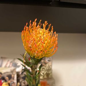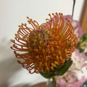 珍しいお花頂き投稿します 左は ピンクッション 右は ケイトウ ファイヤー 針刺しみたいに とげとげして刺さっているみたいな オレンジ色で面白いなあ 元気もらえそ😍😉