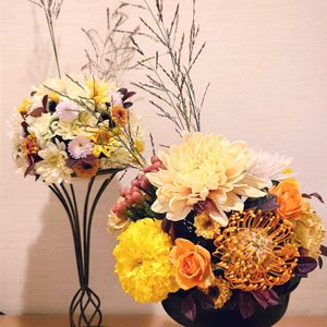 HitoHanaさんのロスフラワーを注文しました。 ハロウィンカラーで嬉しい! 今回どうやってもバランスよく飾れなくて、花瓶3本試してみたけどダメで、結局ふだんあまり出番のない2つの口がある花瓶でやっと納得のいく生け方ができました。