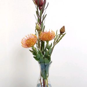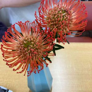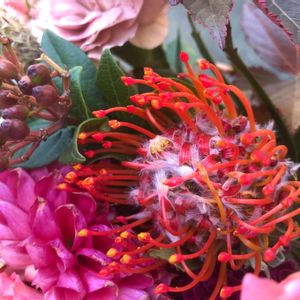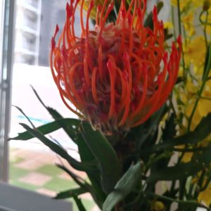 ♪♪♪ 初めて知る名前です 秋色.きれいな.いけこみでした♪ ヤマモガシ科 *レウコスペルマム属 学名:Leucospermum*英名:Pincushions 原産地:南アフリカ 輸入品なので周年出回っていますが、夏~秋に出回り量が多くなります。1本300円~500円くらいで、ネイティブフラワーの中ではお手頃価格--ネイティブフラワーとは花の名前ではなく、オーストラリアや南アフリカなどの特定の地域に自生する花々の総称です-- (ハナラボノート)