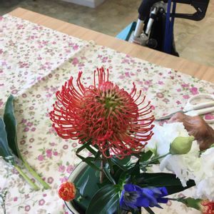 ✴️活花です。いつもの某公共施設内です。 🌼ホオズキ(鬼灯) ナス科、ホオズキ属 原産地:北海道、本州、四国 ⚫️多年草。(地域によっては1年草) ⚫️草丈: 50~90㎝ ⚫️果実は香りが良く甘美があり、生食できる。 ⚫️観賞用として流通しているホオズキは毒性があるので食用にはできない。 🔴花言葉は「自然美」「心の平安」 🌼ピンクッション ヤマモガシ科、レウコスペルマム属 原産地: 南アフリカ ⚫️常緑低木。 🔴花言葉は「どこでも成功を」「降り注ぐ愛」 🌱野バラの実 →2023年8月7日 (⚫️🔴: fromNet🔍️👓️、✴️: 今回は短いですが、私のコメント)